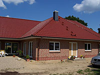 Neubau ca. 450 qm Dachfläche / Dachziegel: Creaton Tonziegel glasiert/ Unterspannbahnen „Delta Maxx“ Laufanlage für Schornsteinfeger / Schornstein verschiefert m. Naturschiefer