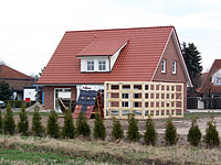 zur Aufnahme eines Firmenschildes mit Walmdach und Balkenlage